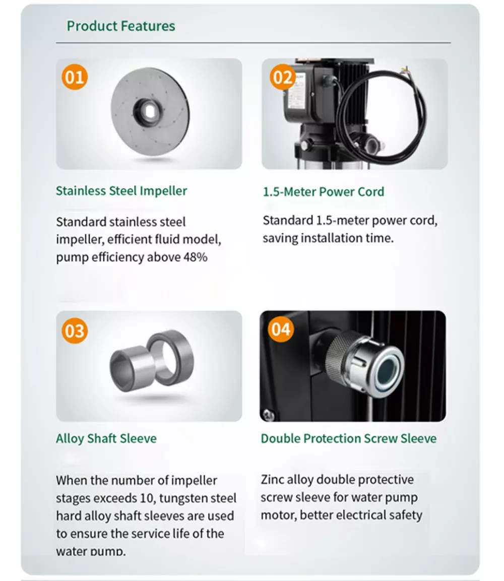 · Mechanische afdichtingen gemaakt van een harde legering + fluorrubber verminderen lekkage en energieverbruik, waardoor een soepele en stille werking wordt gegarandeerd.